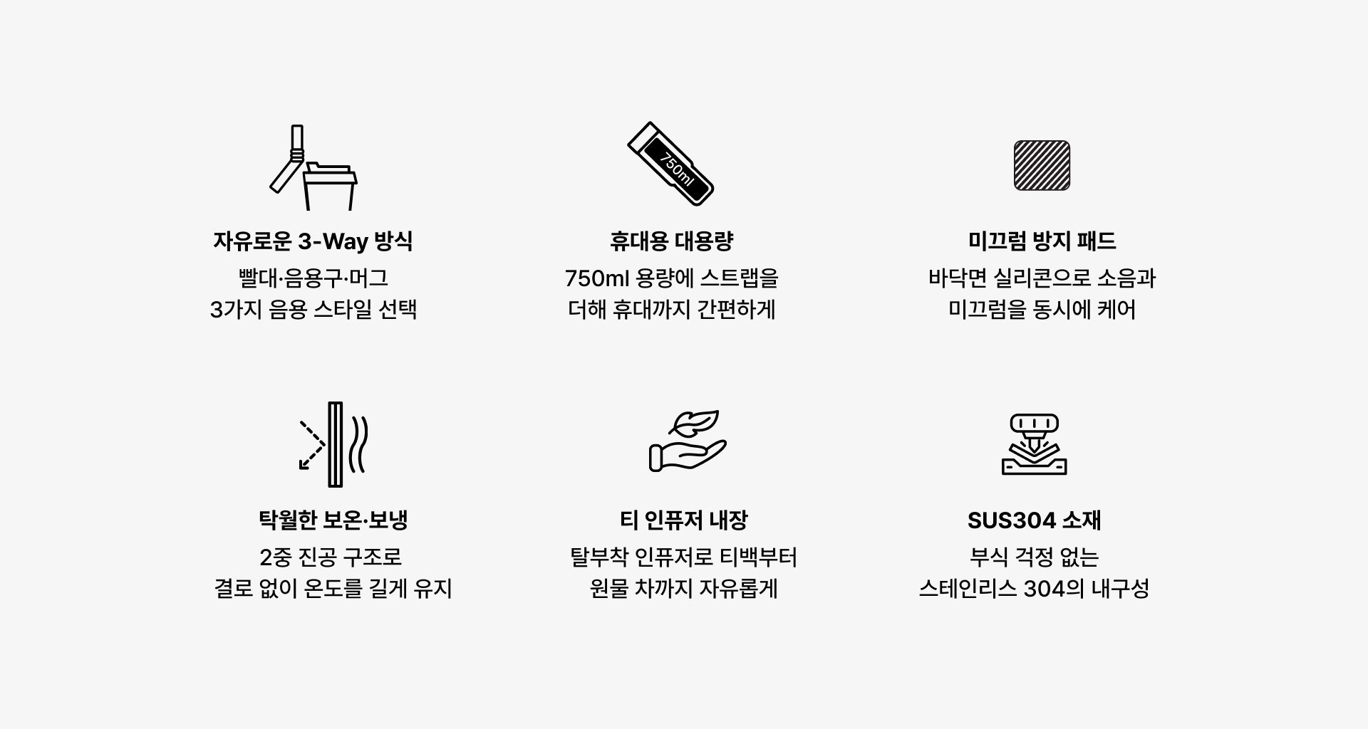 3-WAY 올인원 텀블러-상황에 맞춰 3가지 방식으로 자유롭게 마실 수 있는 750ml 대용량 텀블러로 탈부착 스트랩으로 휴대성을 높였고, 바닥면 소음 방지 패드와 뛰어난 보온 보냉력을 갖춰 어디서든 편리하게 사용할 수 있습니다. 빨대·티 인퓨저·스트랩을 모두 갖춘 750ml 올인원 텀블러입니다. 3-Way 음용 방식과 뛰어난 보온보냉력을 갖춰, 개인 소장용부터 기업 굿즈까지 폭넓은 니즈를 충족하는 커스텀 아이템입니다. 커스텀 제작 상품, 마플