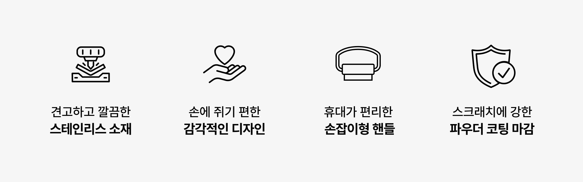 외부는 파우더 코팅 마감으로 생활 스크래치에 강하며, 깔끔한 무광 질감으로 세련된 분위기를 더해줘요.