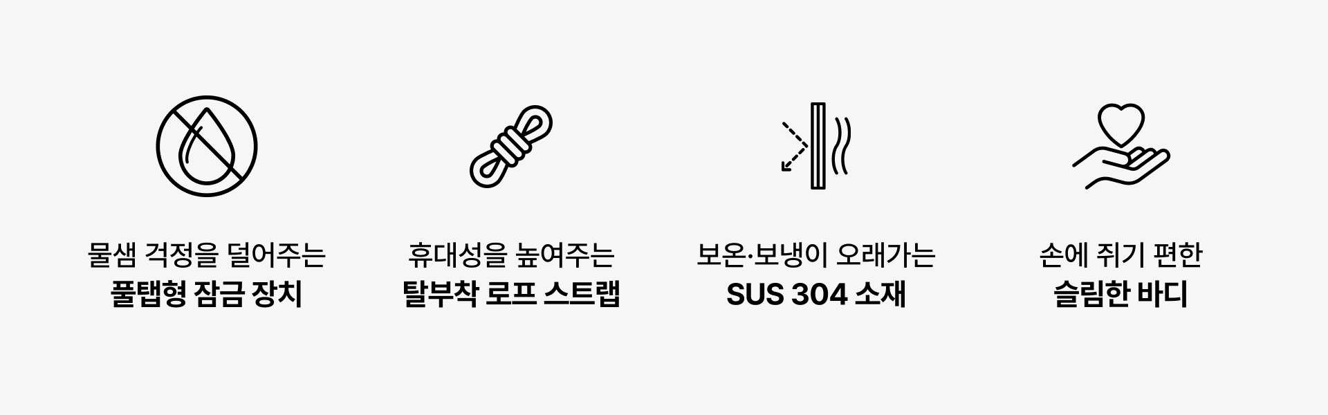 풀탭 형태의 잠금장치로 음용구를 안정적으로 닫아 휴대할 수 있어요.